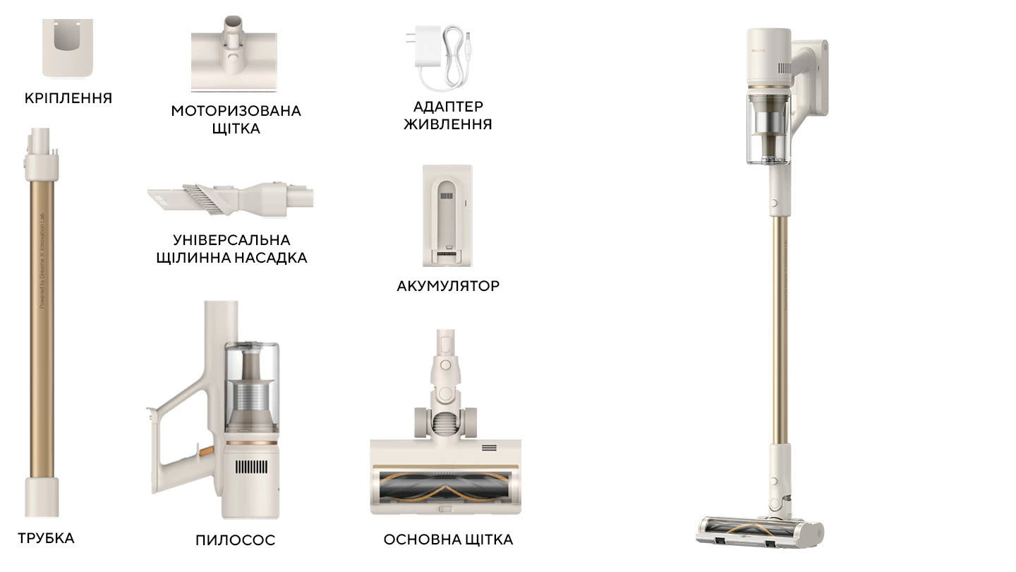 У кожного девайса є своя маленька місія. І у Dreame U20 це — робити прибирання швидким та приємним. Бо тут замість довгих дротів та масивних насадок — свобода рухів без прив’язки до розеток. Корпус важить усього 1,6 кг, тож ви не втомитесь від тривалого прибирання. За автономність відповідає акумулятор на 2500 мАг — його заряду вистачає на 60 хвилин. Потужністю всмоктування 22 000 Па дозволяє збирати пил, пісок та шерсть на всіх типах покриття, від килимів до підлогової плитки. Однак ви не обмежені прибиранням підлоги, а можете очищати меблі чи навіть салон авто. В комплекті йде насадка 2-в-1 для щілин, кутів та меблевих поверхонь, а також моторизована щітка для оббивки та текстилю.