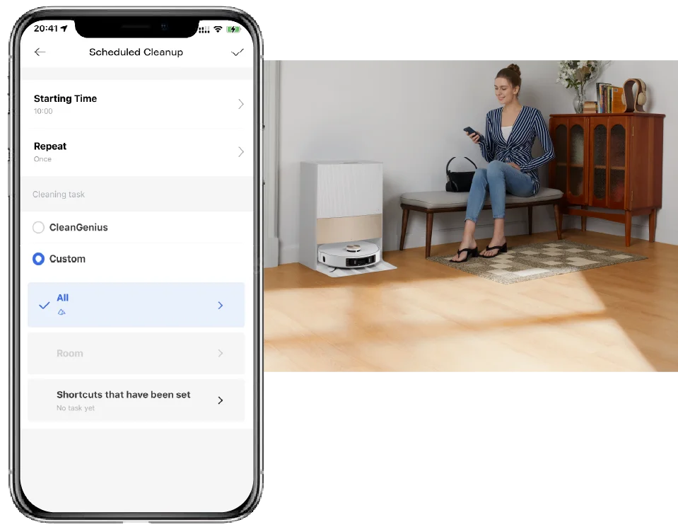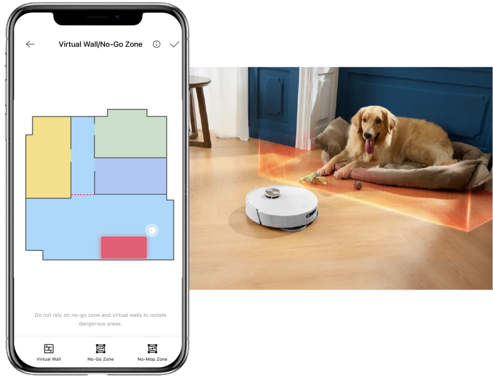 Сегментуйте кімнати, створюйте віртуальні стіни, встановлюйте заборонені зони та визначайте розклад, не виходячи з програми на телефоні.