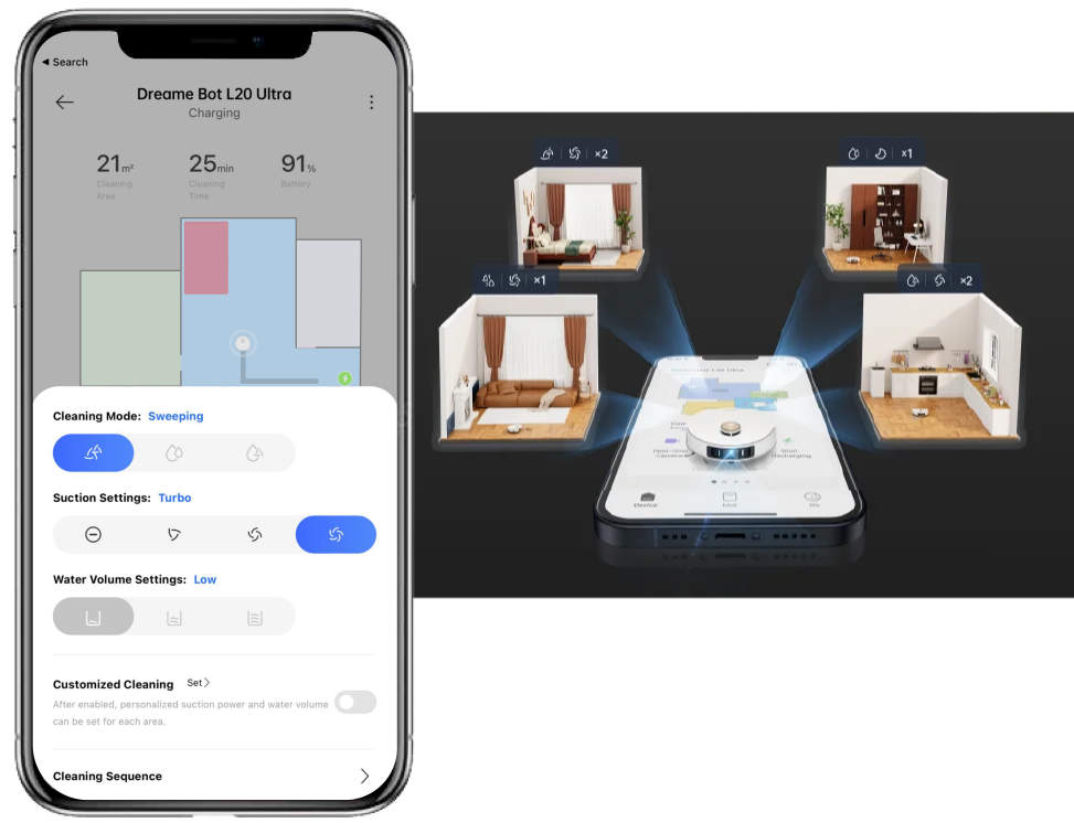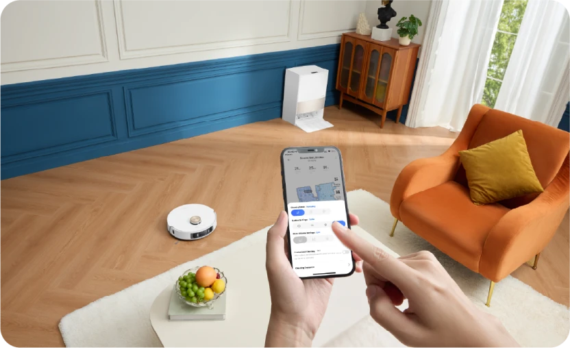 Завантажте нову програму з App Store або Google Play для комфортного використання Dreame-home. Керуйте процесом за допомогою програми, налаштовуючи прибирання відповідно до вашої оселі та розкладу. Сегментуйте кімнати, створюйте віртуальні стіни, встановлюйте заборонені зони та визначайте розклад, не виходячи з програми на телефоні.