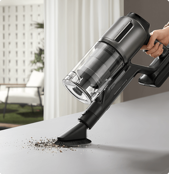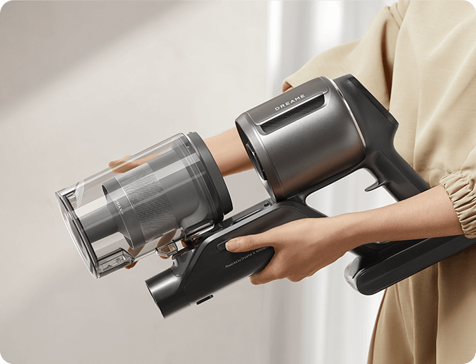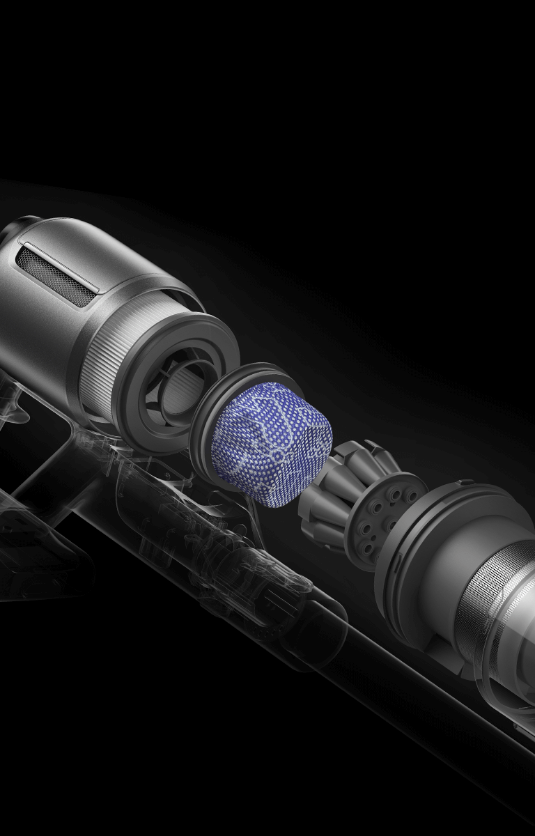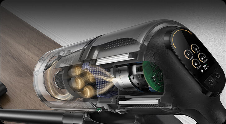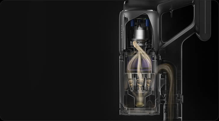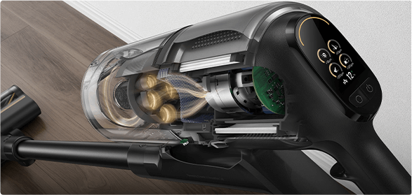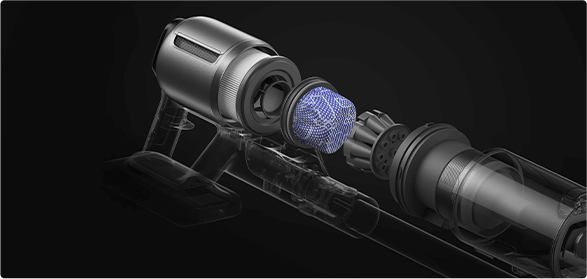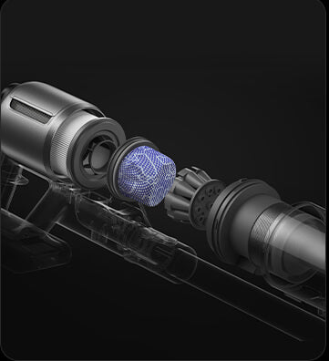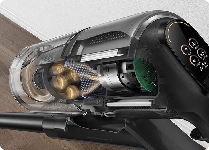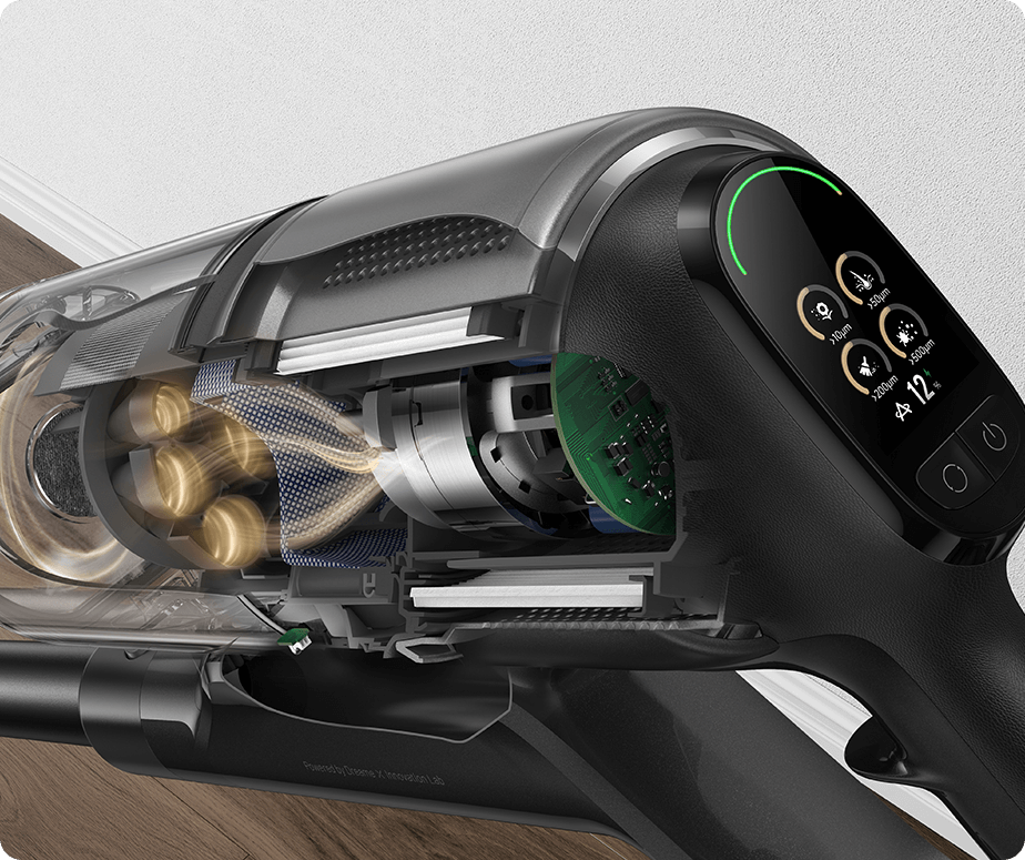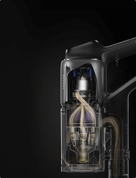 *310 аероват, 150 000 об/хв: на основі даних нашої лабораторії. Фактична продуктивність може відрізнятися. Потужність всмоктування у 310 аероват, що є найвищим показником у лінійці бездротових пилососів Dreame станом на травень 2024 року.